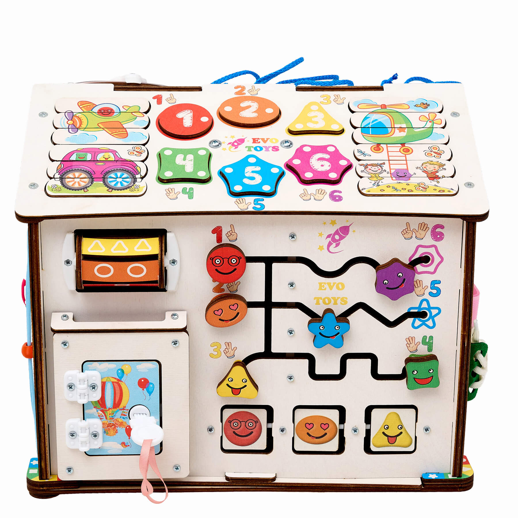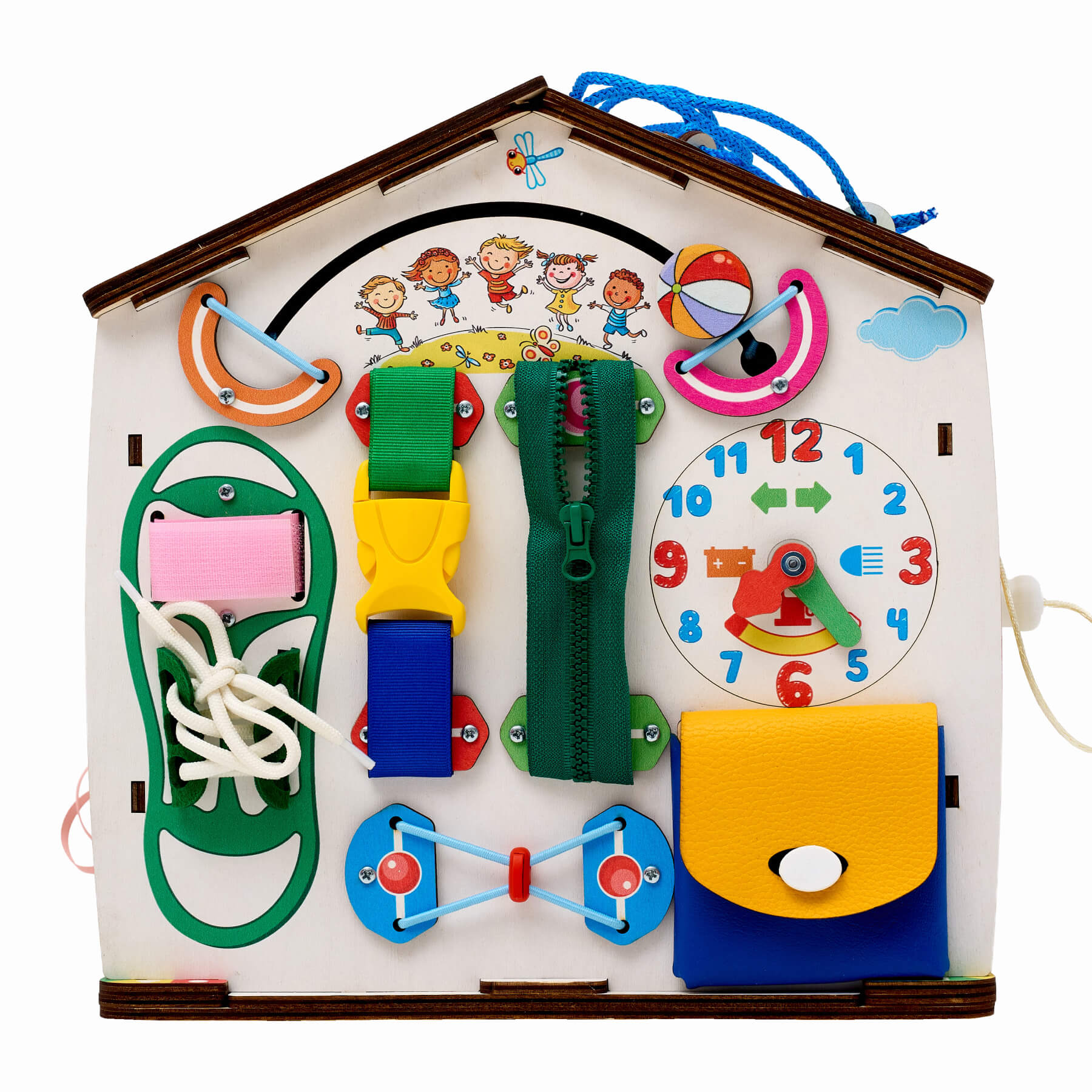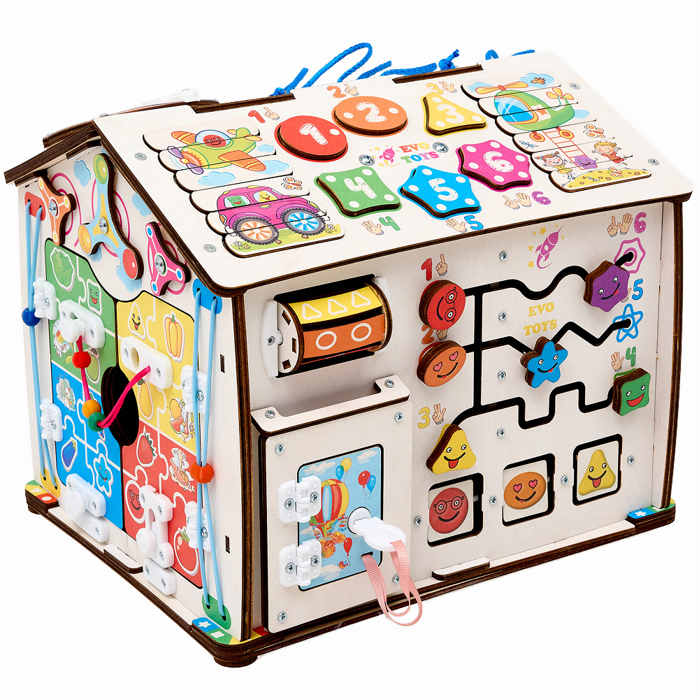 • 4 сторона домика - игра с рогаткой, липучка, змейка, поясной замочек, змейка, кармашек с пуговкой, шнуровка, ящик тайник;